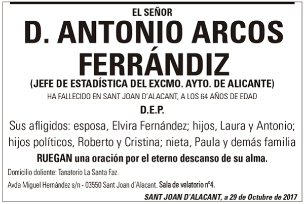 Antonio Arcos era de esas personas que no cambian nunca para bueno. Buena gente de Murcia. No solamente era físicamente igual que el día que nos conocimos sino que tampoco varió ni un ápice su manera de ser y pensar. Nada sectario, demócrata como el que más, y comprometido con la izquierda desde una posición intelectual, ha muerto relativamente joven y enamorado otra vez. Enamorado de su nieta Paula que, en definitiva, va a ser quien más la echará de menos junto con sus hijos Laura, empleada en BMN, y Antonio, licenciado en Ciencias del Deporte, y su esposa Elvira Fernández compañera desde siempre en la política y el hogar, y hoy funcionaria de la Seguridad Social en activo.
