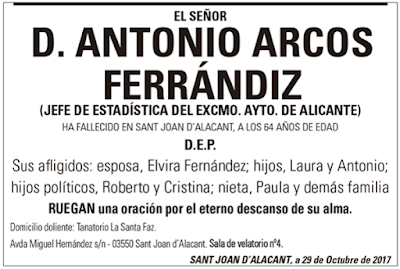 Tras una intensa actividad política e ideológica, siempre desde una coherencia a prueba de bomba y una honestidad sin límites, nos volvemos a reencontrar siendo ya Antonio Arcos jefe del Departamento de Estadística del Ayuntamiento de Alicante al figurar yo como promotor y primer firmante de la solicitud para dedicar una calle de la ciudad al profesor Antonio Pino Romero, fundador y primer director de la Escuela Europea, también fallecido hace pocas semanas. Aunque la ex alcaldesa Sonia Castedo pasó del tema, mi amigo empujó todo lo que pudo un expediente ahora reactivado desde un Ayuntamiento gobernado por el tripartito de izquierdas (PSOE-IU-Compromís), con él ya en la UCI del hospital clínico-universitario de San Juan de Alicante los últimos treinta días de su fecunda y entregada vida a ideales y principios.
